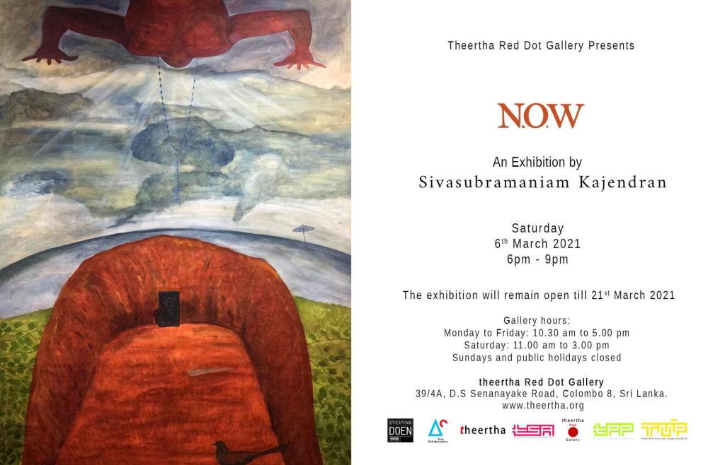 தீர்த்த ரெட் டொட் கலைக்காட்சி கூடம் (Theertha Red Dot Gallery) பெருமையுடன் வழங்கும் “தற்போது” (N.O.W) எனும் தொனிப்பொருளில் முற்றுமுழுதாக சிவசுப்ரமணியம் கஜேந்திரனால் (சிவா-கஜா) படைக்கப்பட்ட தனிநபர்-காண்பிய காட்சிப்படுத்தலானது எதிர்வரும் சனிக்கிழமை (06 பங்குனி 2021) மாலை 6.00 க்கு பொறள்ளையில் அமைந்துள்ள தீர்த்த ரெட் டொட் கலைக்காட்சி கூடத்தில் ஆரம்பமாகவுள்ளது. இக்கண்காட்சியானது 21 பங்குனி 2021 வரை மக்கள் பார்வைக்காக திறந்திருக்கும்.